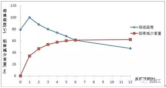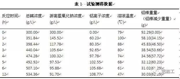 取7支圓柱狀小鋁棒(直徑D=21mm,長度L=100mm),重量為92.3±0.1g,配備7份500mL氫氧化鈉質量濃度均為300g/L的氫氧化鈉溶液。將鋁棒分別置于氫氧化鈉溶液中,分別放置1、2、3、4、5、6、12小時。到達目標時間后,測定溶液的總堿濃度、游離氫氧化鈉濃度、鋁離子濃度和溶液溫度。取出鋁棒,用濾紙輕擦干凈后,稱取鋁棒重量。
