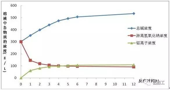 隨著反應時間的增加,游離氫氧化鈉濃度逐漸減少,鋁離子濃度逐漸增加,當反應約3小時后,游離氫氧化鈉濃度和鋁離子濃度的變化趨于平穩。這是因為隨著反應時間的增加,氫氧化鈉溶液里富集溶解的鋁越來越多,鋁離子濃度上升,再繼續溶解更多鋁時,氫氧化鈉溶液的溶解能力逐漸下降,所以游離氫氧化鈉濃度和鋁離子濃度變化的速度逐漸下降。