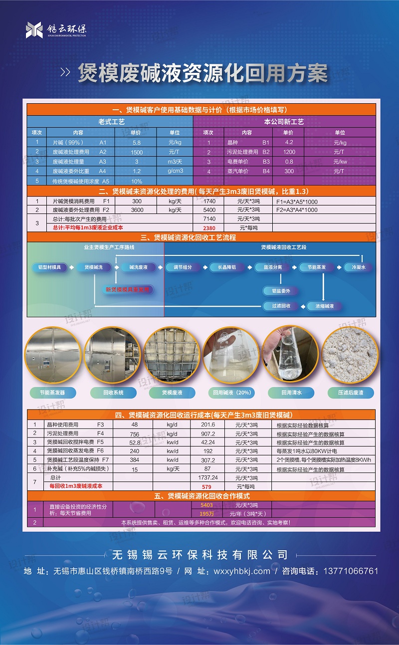 本公司處理煲模廢液經驗豐富,能根據給排堿濃度等進行有關設計,為用戶提供較為理想、投資省、處理效果好的工藝設備。為嚴格遵守有關環境法規,保護環境,本著經濟建設和環境保護同步進行的“三同時”原則。經客戶處實地調研,并經多年水處理與資源化利用的成功實踐經驗的基礎上,針對甲方堿液水質的特點,采用“調節組分+長晶降鋁+固液分離+節能蒸發+回收堿過濾回用的純化工藝,該處理工藝較為簡單,操作運行方便,運行費用低廉,回收堿液品質穩定,真正實現煲模堿的“零排放”回用。