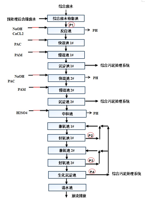 預處理后的含鎳廢水自流進入綜合廢水池與綜合廢水混合,經一定的停留時間調質均勻后,通過提升泵提升至反應池,加入NaOH溶液、CaCL2溶液,NaOH投加量由pH儀表自動控制;反應池出水溢流入快混池1#和慢混池1#,在快混池1#中加入PAC溶液,在慢混池1#中加入PAM溶液,經助凝反應后的綜合廢水流入沉淀池1#進行固液分離,沉淀池1#的上清液流入快混池2#和慢混池2#,在快混池2#中加入NaOH溶液、PAC溶液,NaOH投加量由pH儀表自動控制,在慢混池2#中加入PAM溶液,經助凝反應后的綜合廢水流入沉淀池2#進行二次固液分離,沉淀池2#的上清液流入中和池;在中和池中加入稀硫酸溶液,硫酸投加量由pH儀表自動控制。